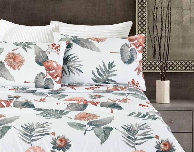 Juego de Sabanas estampadas color blanco con hojas y flores naranjas de 600 hilos 50% Algodón. De muy buena calidad